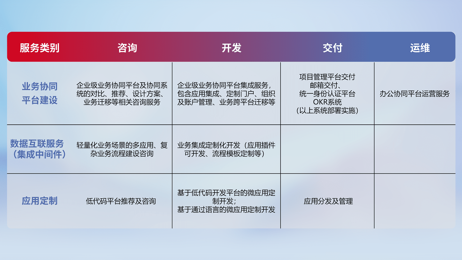 针对钉钉、、、企微、、、IDaas等平台级产品提供产品的规划、、、、方案、、、、交付、、、、定制化开发等服务,,实现如统一协同办公、、、、智能客户服务、、、混合会议管理、、智能数据查询、、、等业务场景,,,,实现数字化转型。。